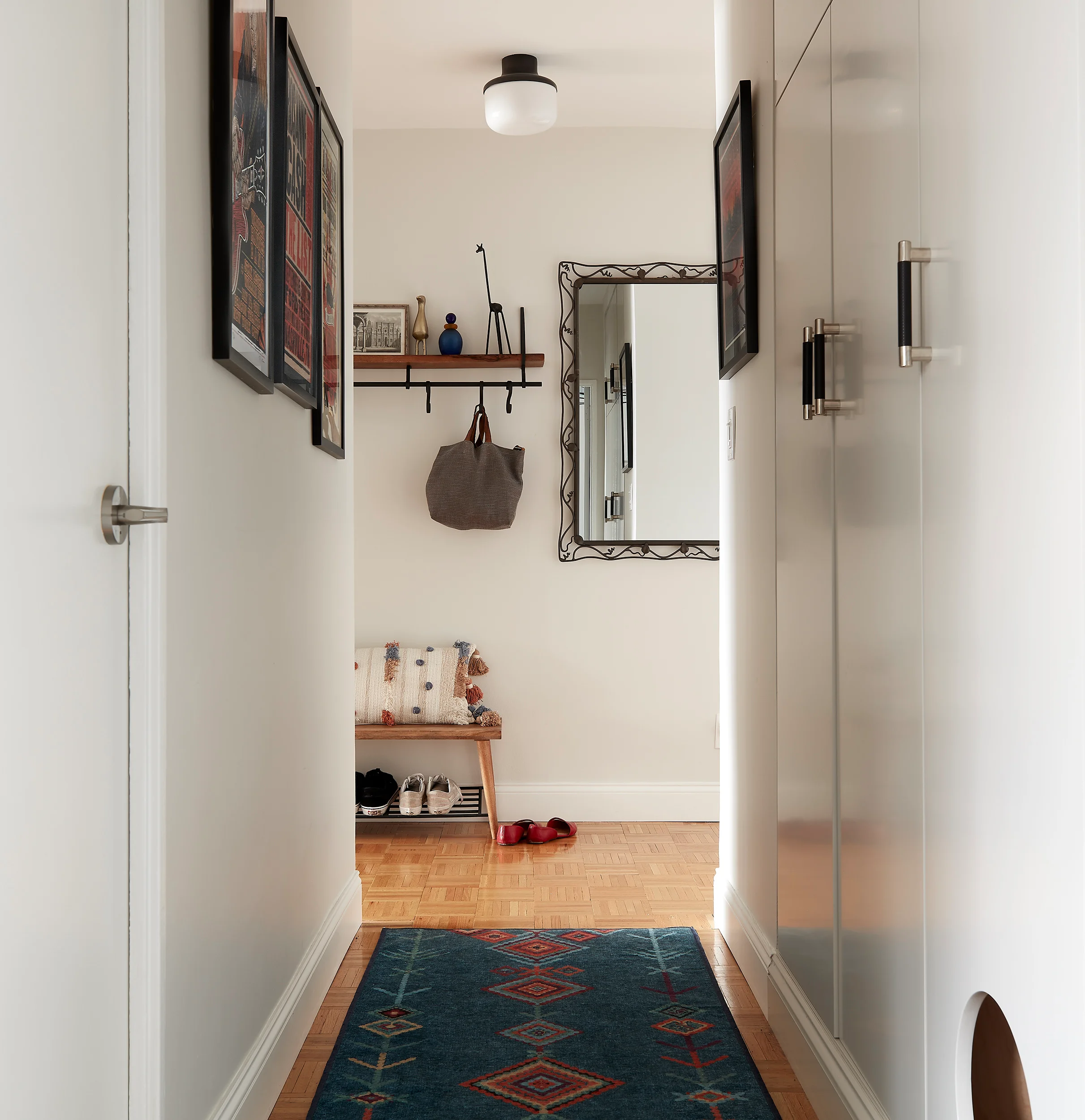 Maximizing storage for this couple was important as they were downsizing from a larger home. Creative custom cabinetry, such as using a niche to build a storage and display unit for dishes, helped provide useful space. Addressing the unique challenges of living in a NYC apartment with a pet was another challenge. A discrete space for the litter box was creatively designed into the hallway custom cabinetry, ensuring both functionality and a clean aesthetic.