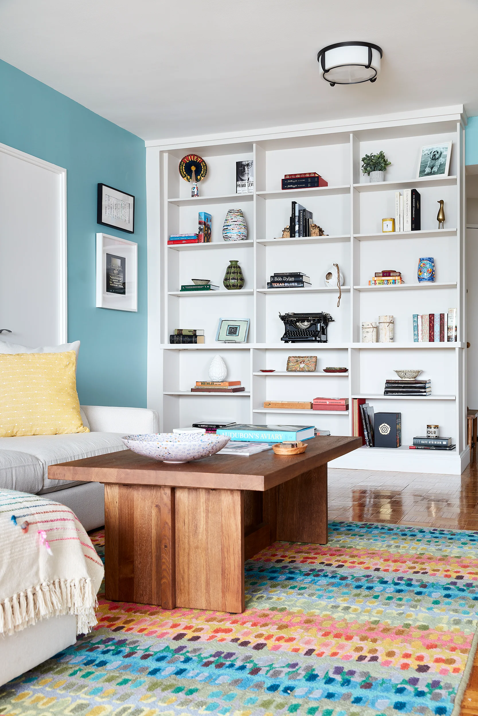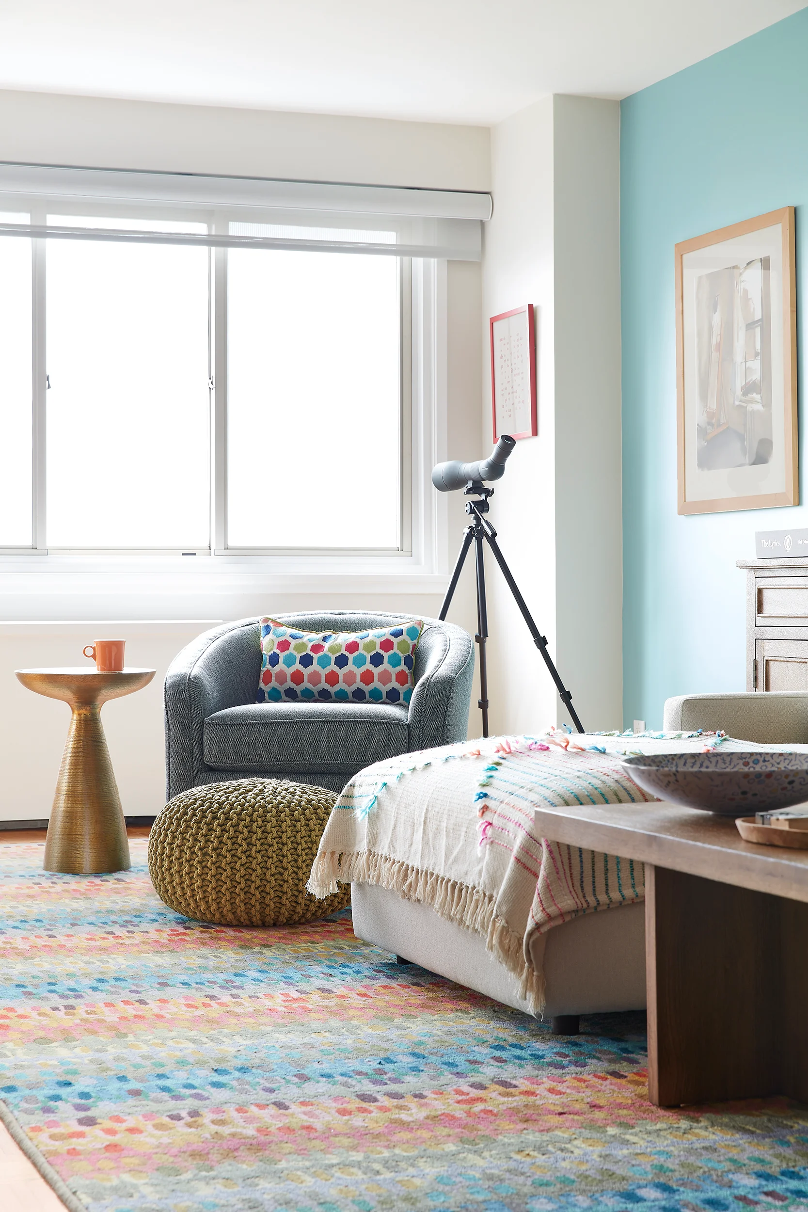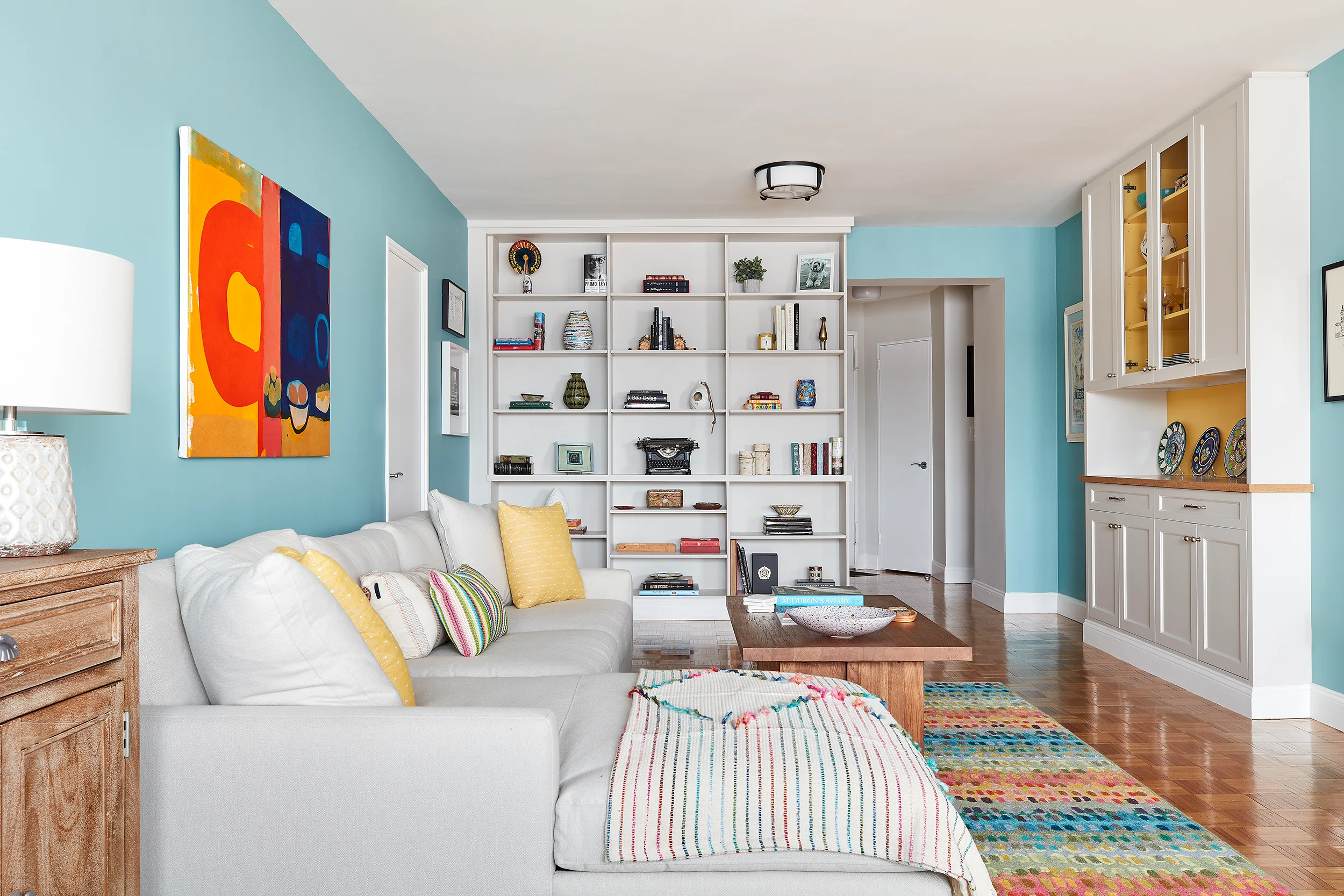 This colorful apartment in Riverdale NYC in The Bronx, was designed for a nature-loving photographer, his wife and their cat Bringing cheerful colors into the space, to complement their art and accessories was our jumping off point of style inspiration.
