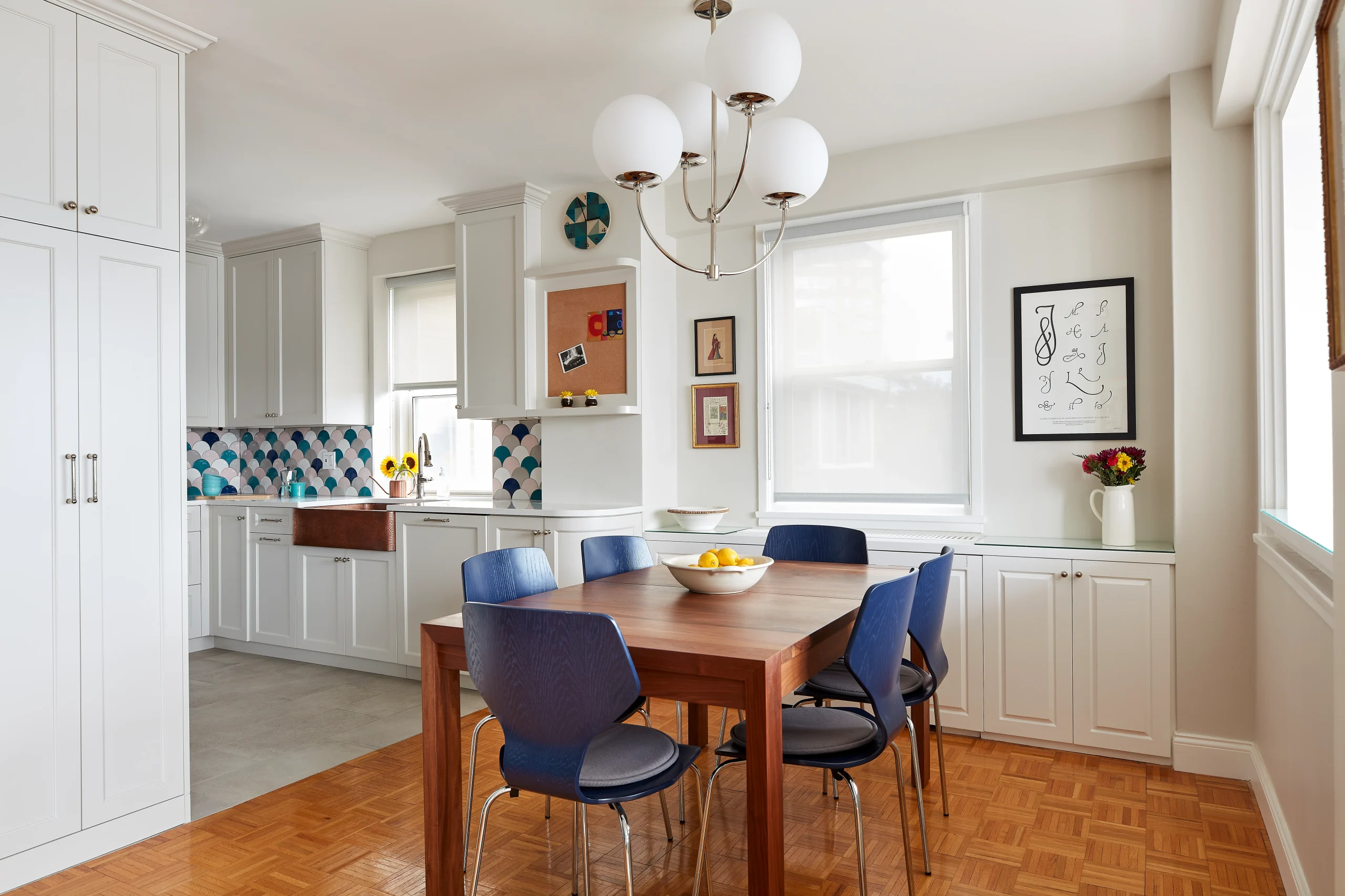 The kitchen was completely renovated in order to open the space and bring in more natural light. The playful, colorful backsplash ‘pops’ off of the more muted, classic cabinetry design, and the copper farm sink adds character and texture to the room.