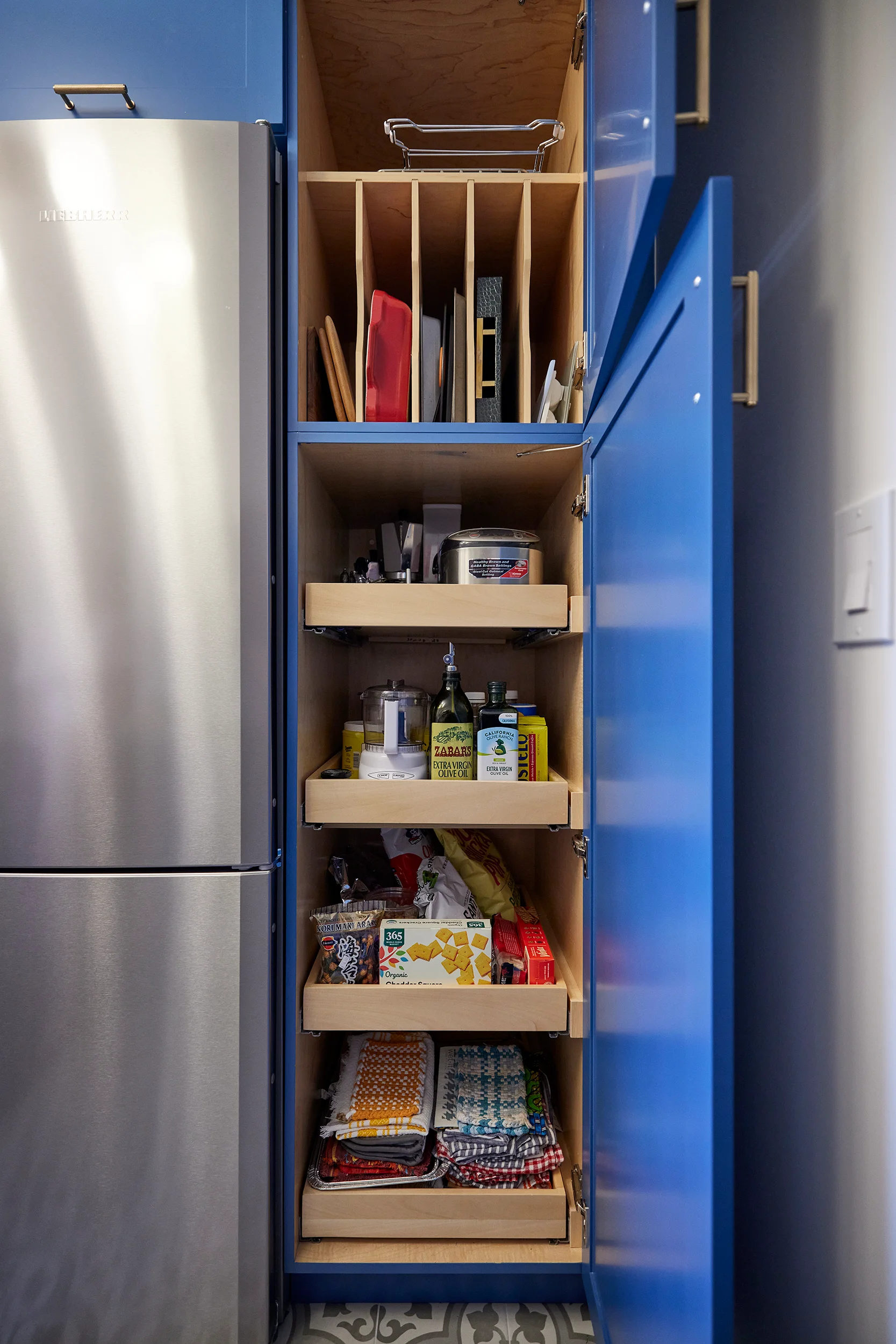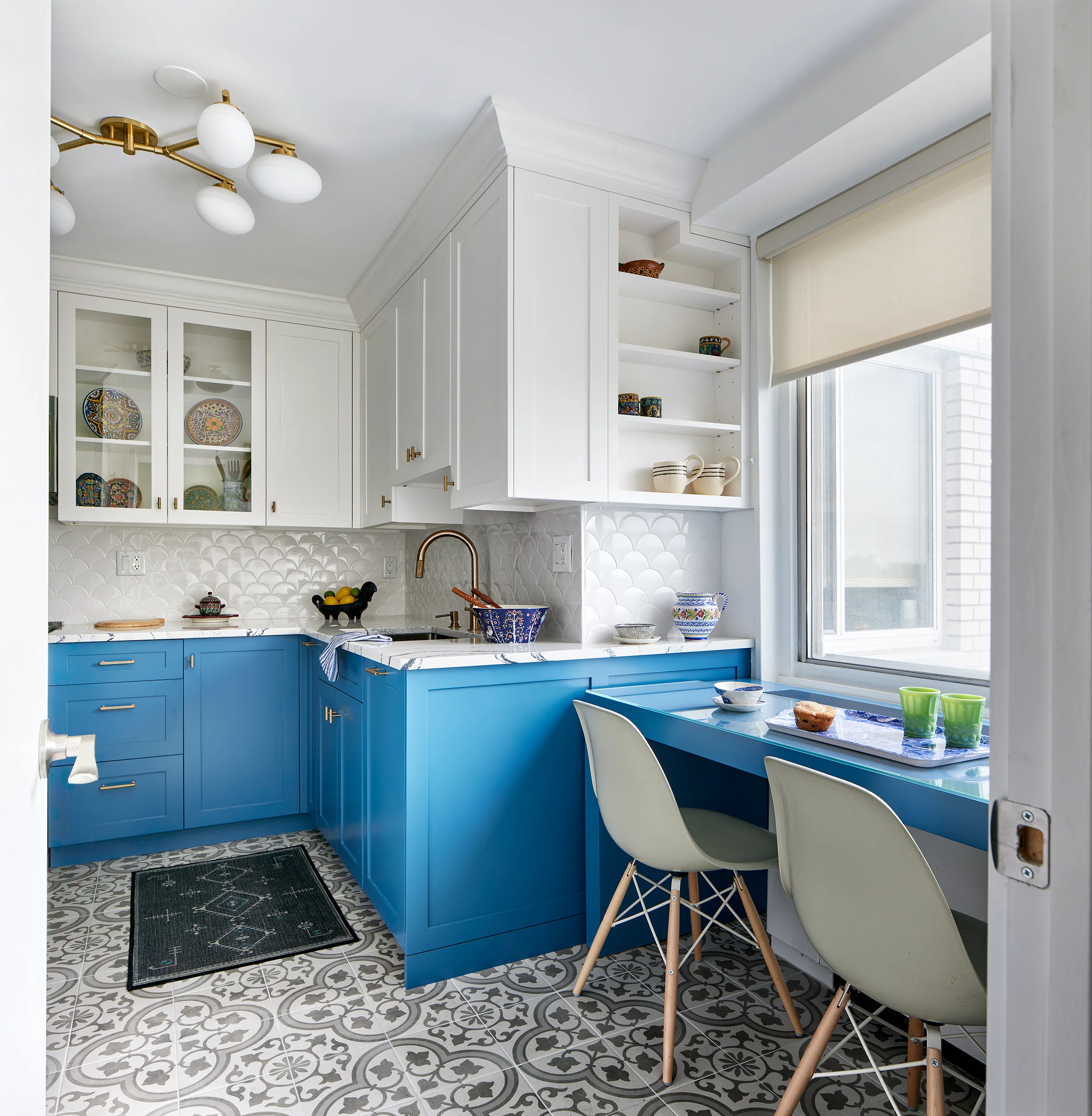 For the eat in kitchen, we used a fun bold floor tile with white and blue cabinetry to highlight their accessories and art collection. Since the floor tile was a bold pattern, we chose a white backsplash in a fish scale pattern to add interest, but not compete with the other elements.